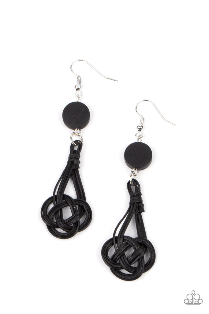Black wicker-like laces delicately twist into a knotted frame that attaches to a dainty black wooden disc, creating an earthy display. Earring attaches to a standard fishhook fitting.