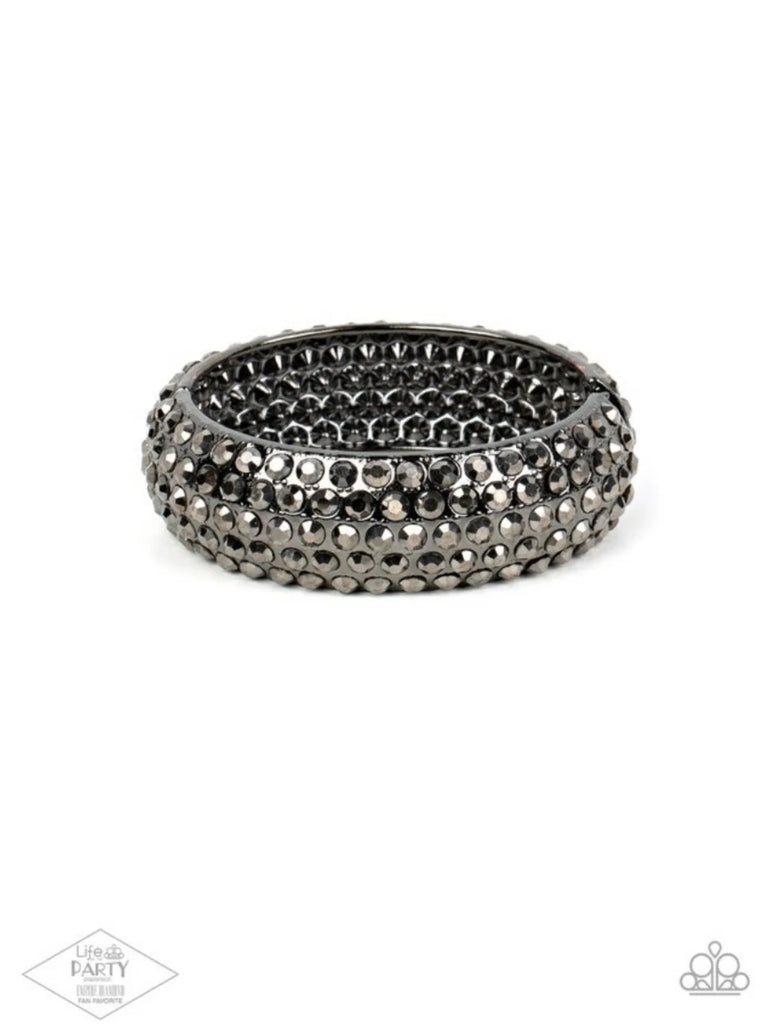 Featuring a must-have hinged closure, the front of a thick gunmetal bangle is encrusted in row after row of smoky hematite rhinestones. The cuff-like bangle features a slight beveled surface, bringing the blinding sparkle to the forefront of this show-stopping masterpiece.